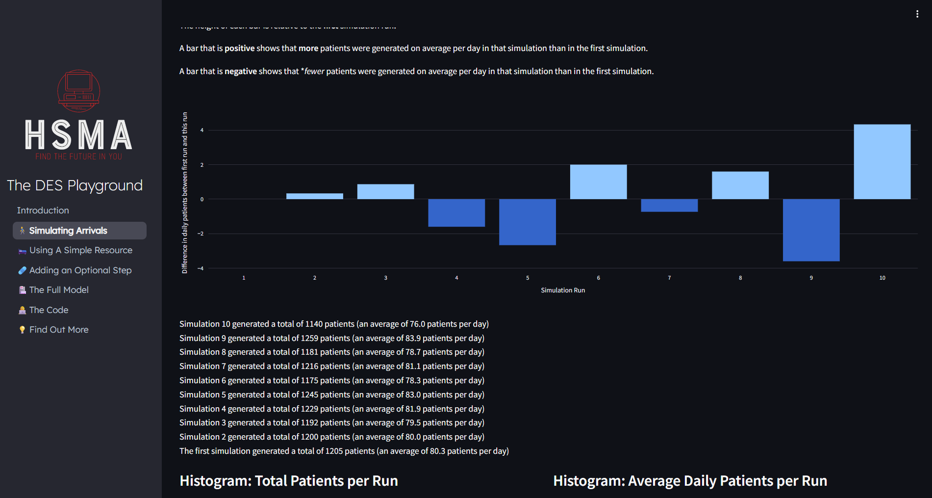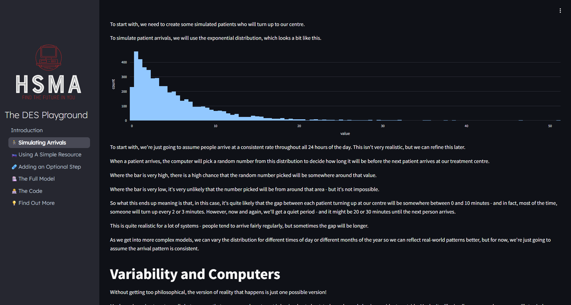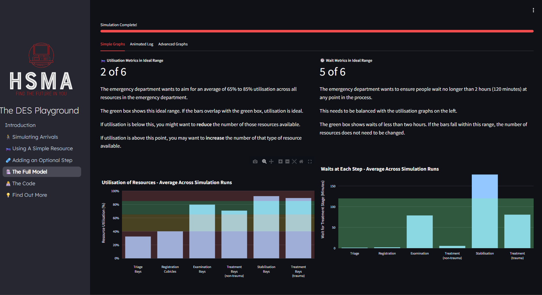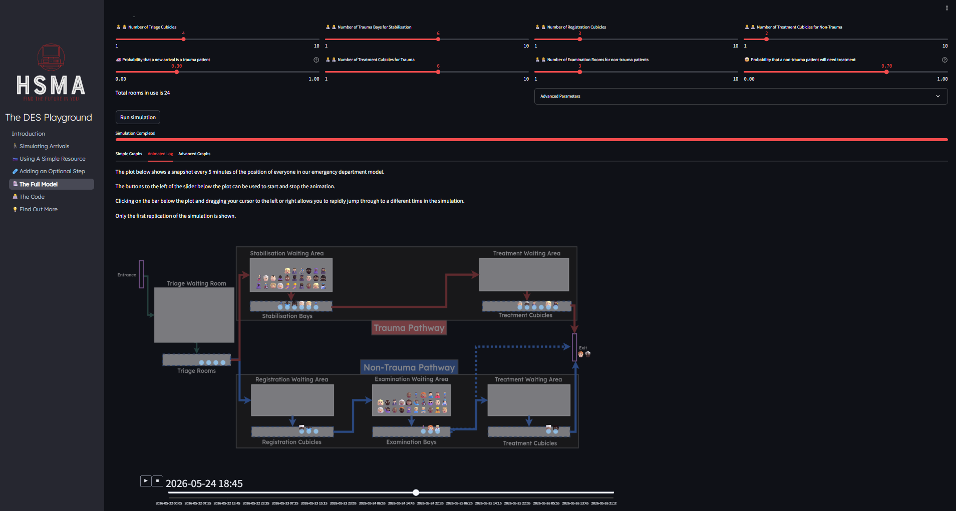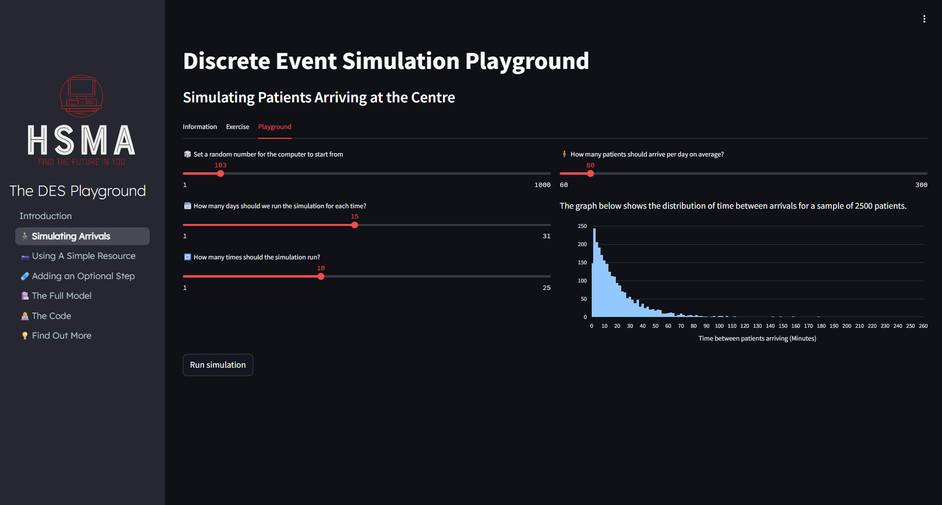 The Health Service Modelling Associates (HSMA) programme provides a Discrete Event Simulation playground, introducing some of the key concepts of DES.