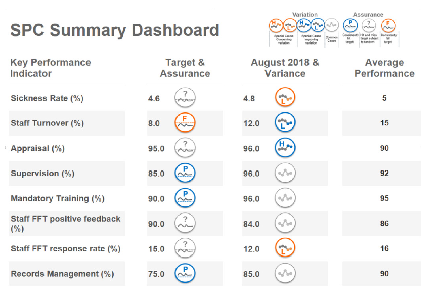 An SPC summary report to replace a RAG rated might look like this. The use of the icons helps to draw attention to the metrics of most concern, and helping to steer people away from worrying unnecessarily about tiny shifts in the ‘wrong’ direction that are meaningless when you step back and look at the data in this way.