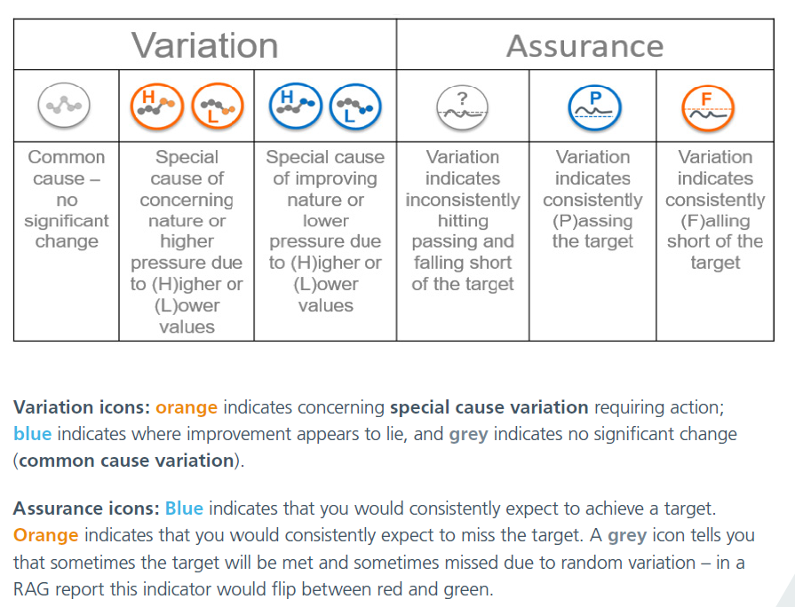 These icons - which will be automatically applied when data meets particular criteria if you are using an NHS-aligned tool to make your SPC charts - can help to quickly pick out areas of concern.