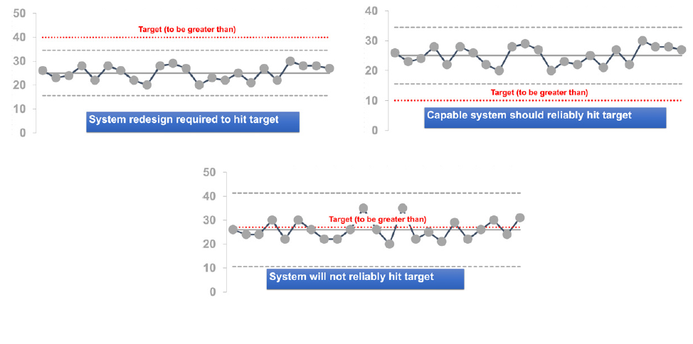 - If the target line does not fall within the control limits, this suggests that the system will either reliably meet the target, or not